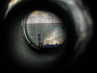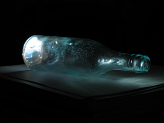 An 8mm film loop is projected onto the base of a small glass bottle, which lies on a pile of old books and piano music. The film shows a hazy seascape, shot from the stern of a moving ferry boat. The distant harbour gets gradually smaller as the ferry moves out to sea; water churns behind the vessel; a small, white sailboat drifts into shot.