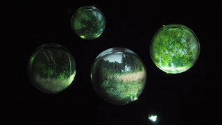 Our installation echoes this process using sound recordings and photographic sequences captured in forests. The image sequences are fragmented, shuffled and projected into constellations of suspended glass spheres. Embodied in these spheres, the image fragments become suggestive of the places in which they were initially recorded.